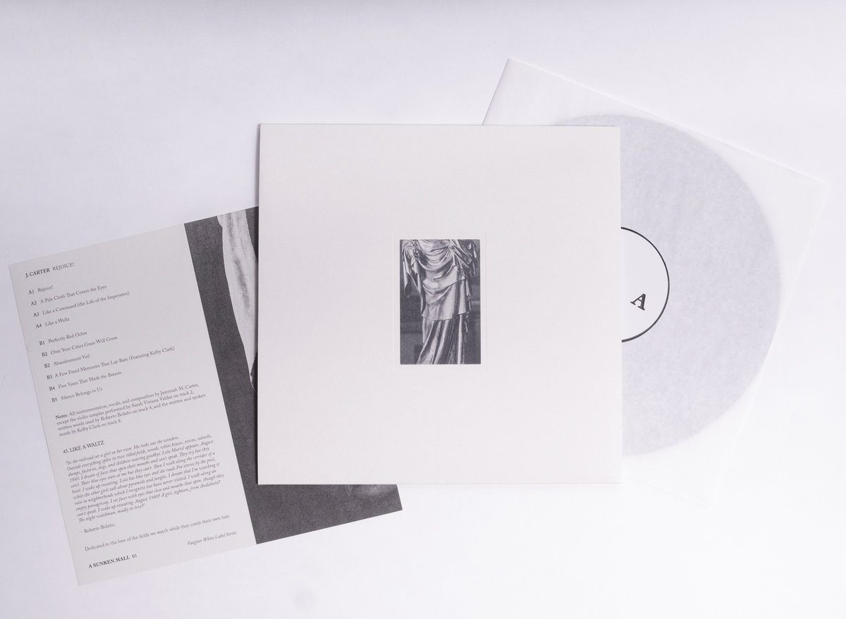 The cinematic samples of stringed instruments on the opening Title Track, along with a great deal of the A-Side, paints a thousand overlapping landscapes, of plains, of prairies, of mountains. They clash at times, in prickling discord, like dragonflies disturbed in their hovering atop endless fields of cattails. But, at others, they mingle with Carterʼs gorgeous, lush synthesizers, graciously oozing a fullness both enriching and wholly melancholy. These tracks are simultaneously irksome and soothing, the A-Side echoing holograms of a similarly sad theme throughout—taking its time with us, for the benefit of our own self-reflection. The incorporation of the spoken word of Roberto Bolañoʼs “43. Like A Waltz,” on the track of the same name, humbly nods to timeless and scenic summers, or not summers—a beautiful forgetmenot.